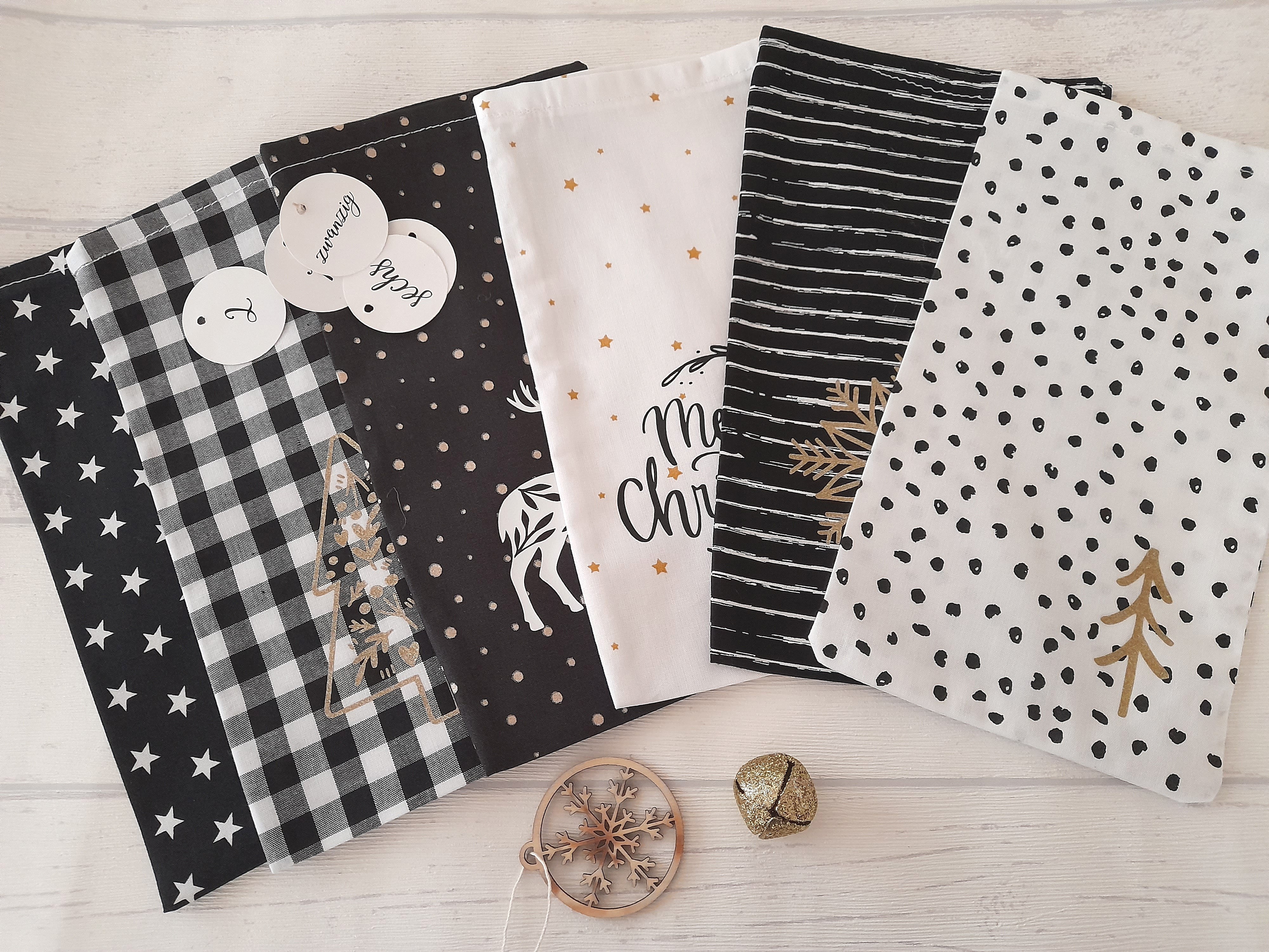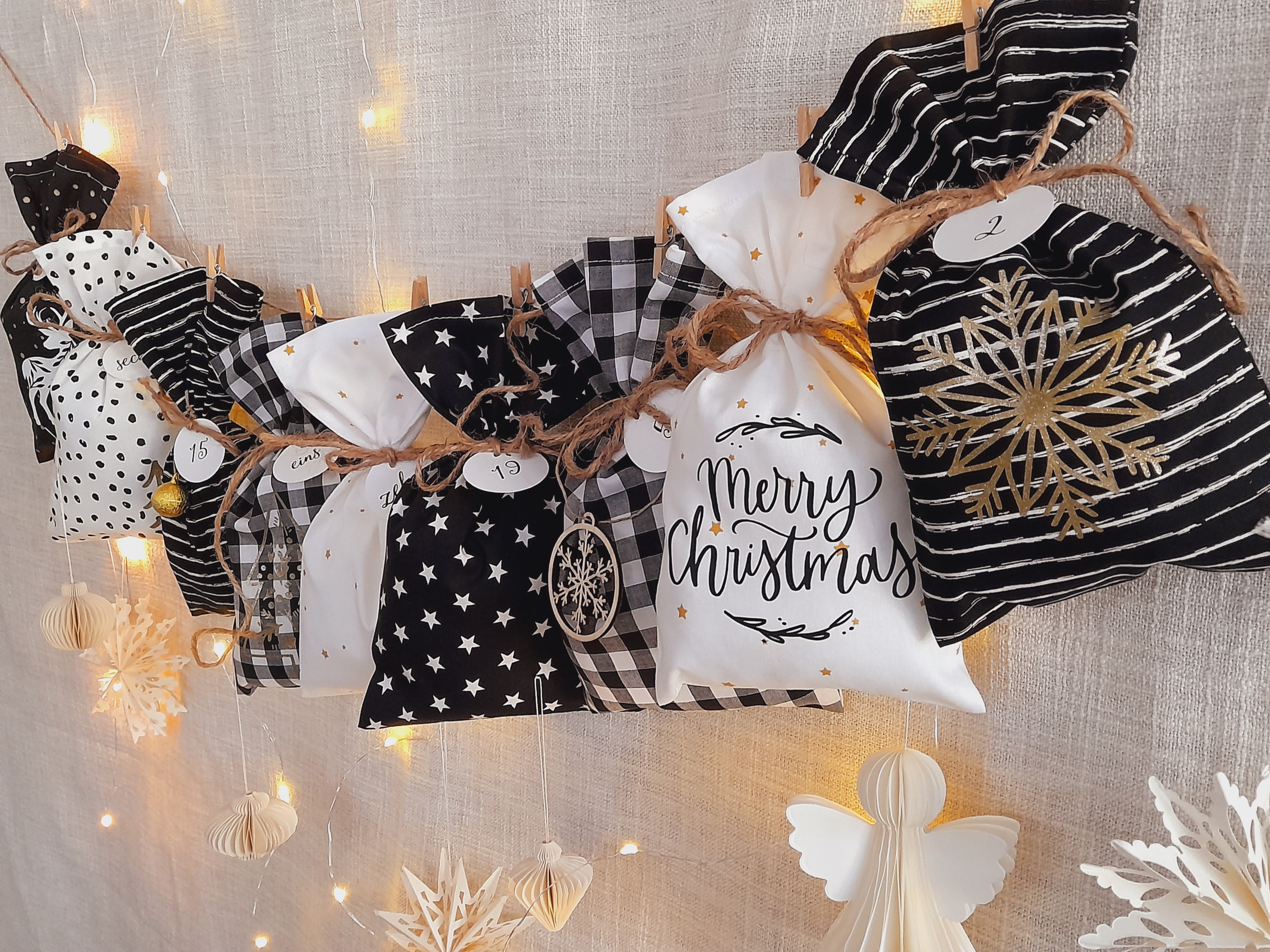 DIY Adventskalender – Set mit 24 Stoffbeuteln, Jutekordel & Dekoanhängern