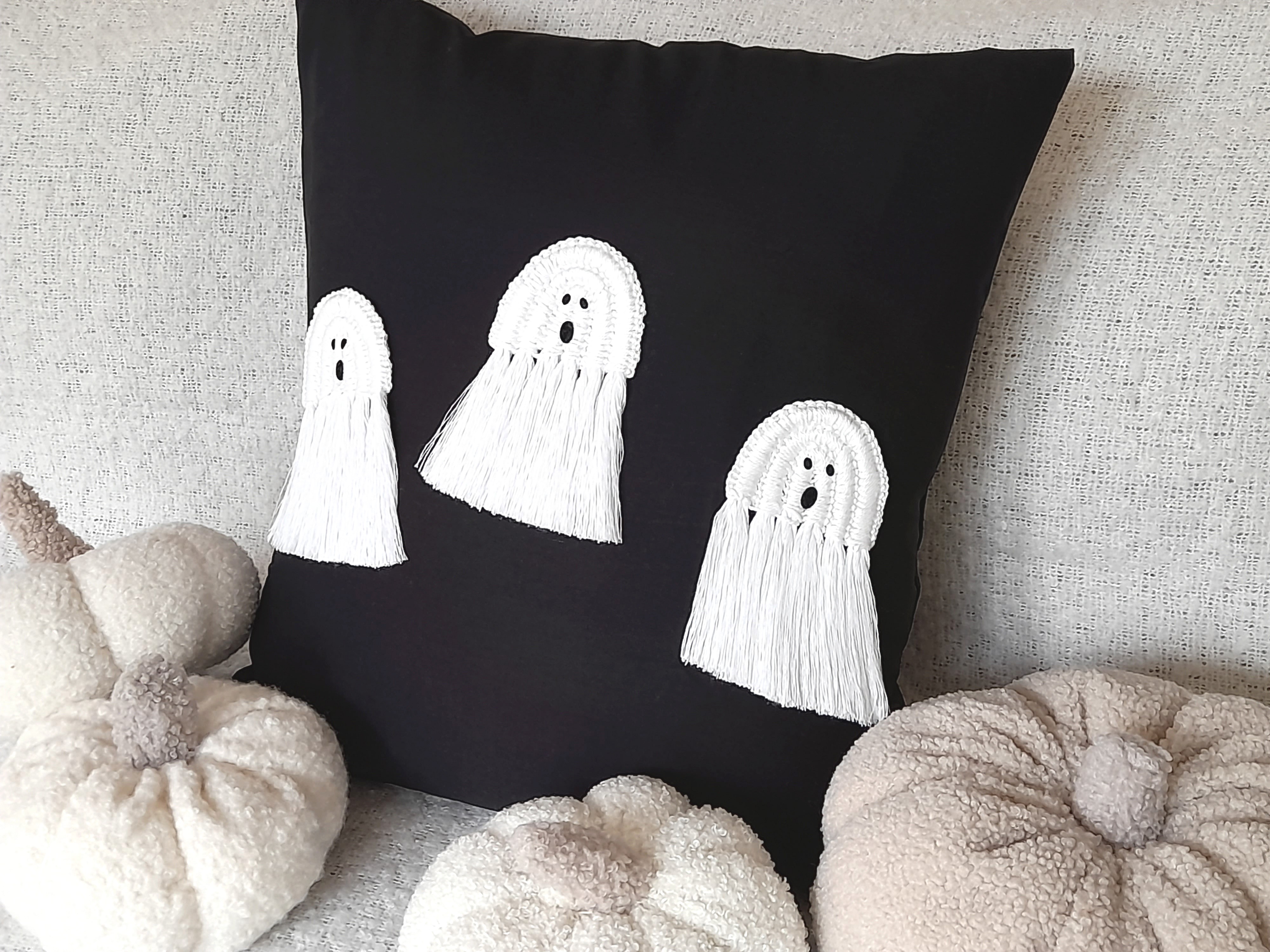 Zuckersüße Kissenhülle mit dekorativen Geistern aus Makrameegarn