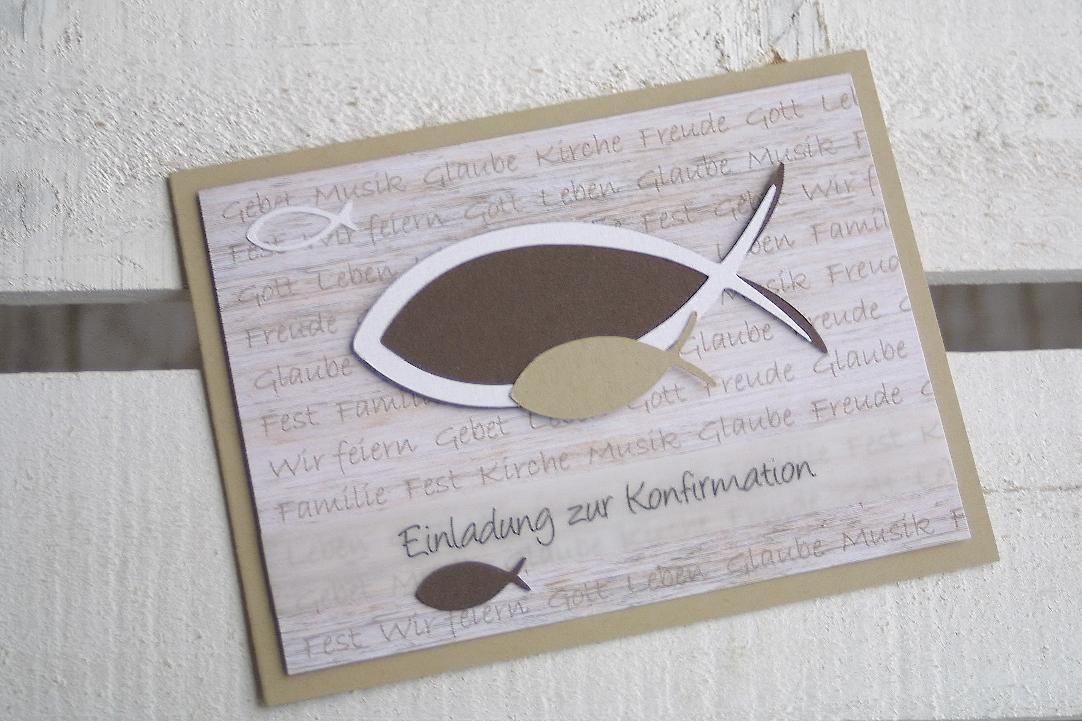 Der Text „Einladung zur Konfirmation“ wird auf Transparentpapier gedruckt und über das Designerpapier gelegt. Wünschen sie einen anderen Text, geben Sie diesen beim Bestellvorgang ins Nachrichtenfeld ein.