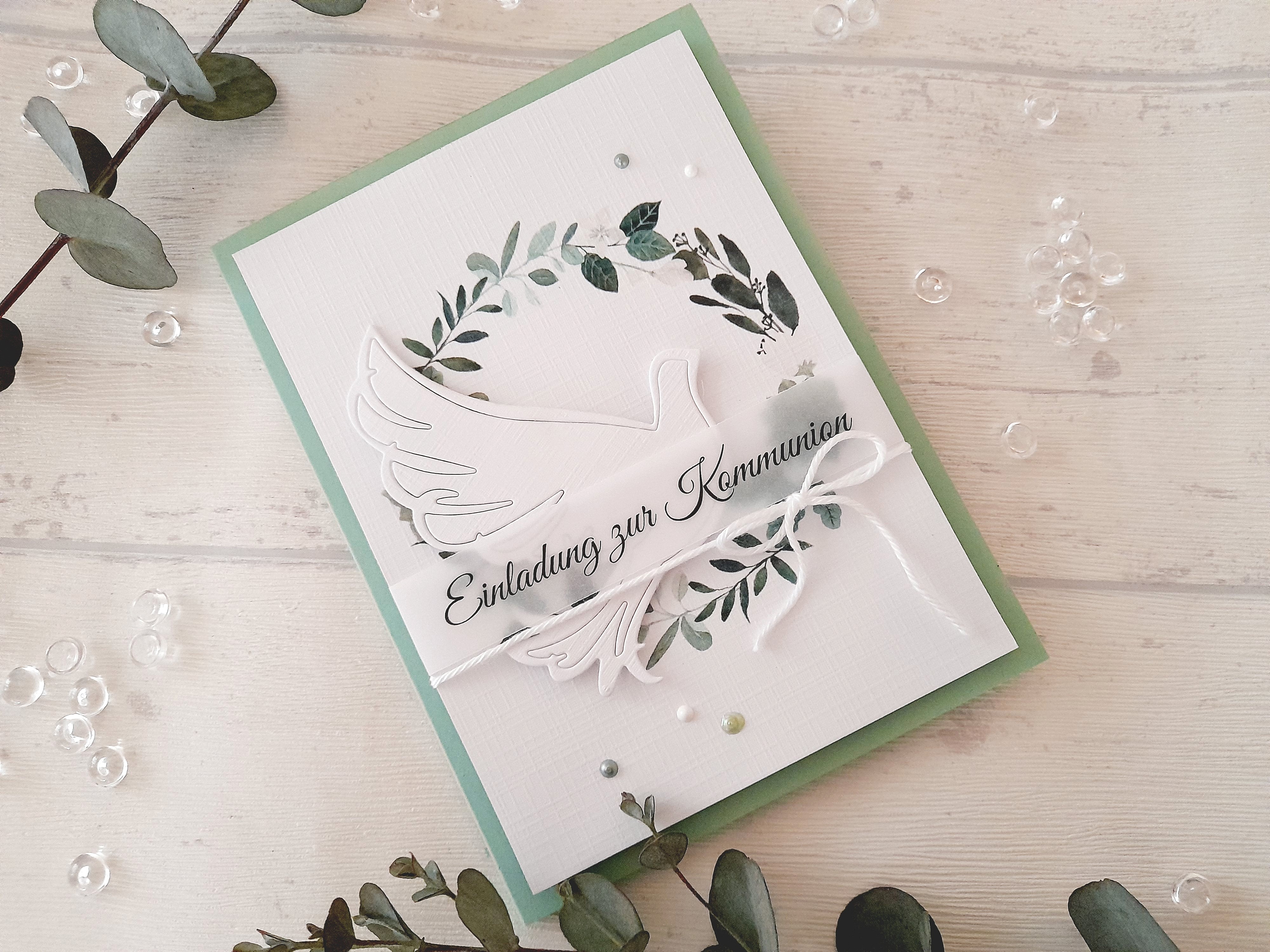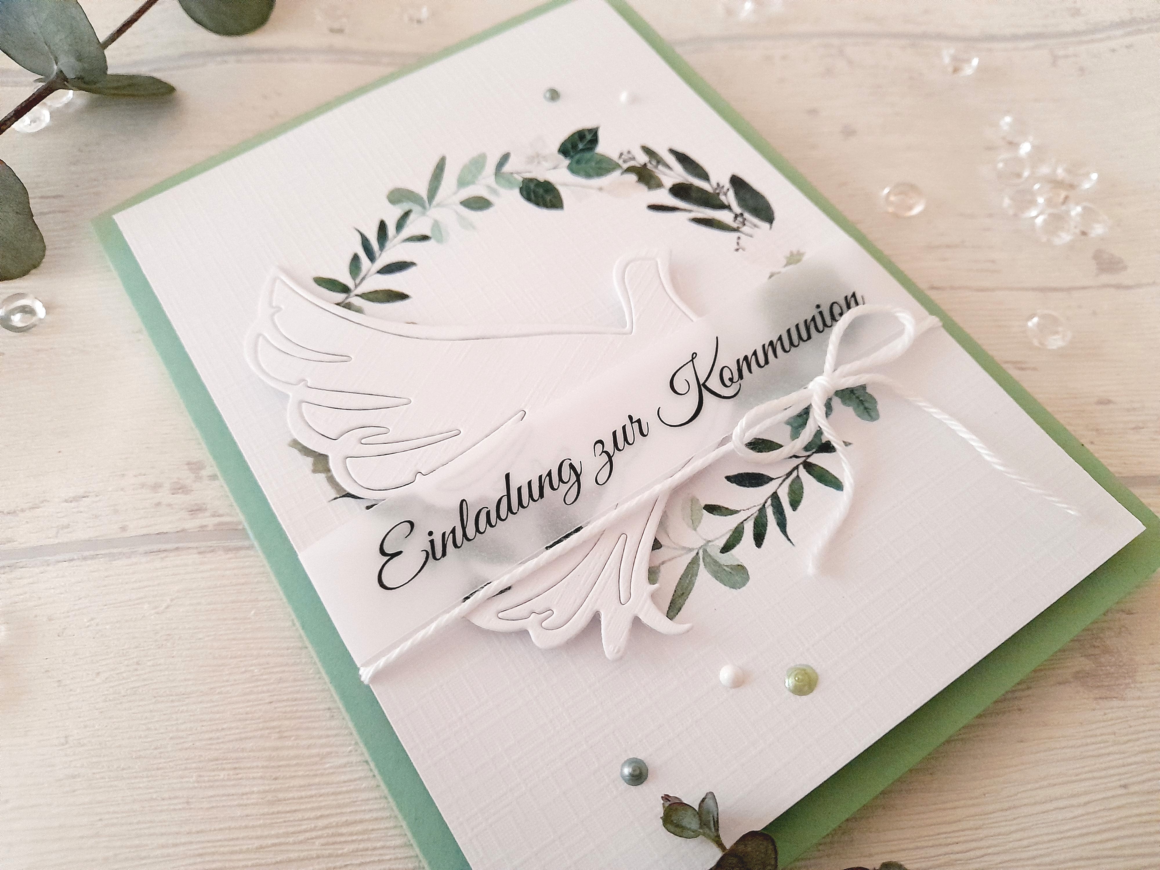 Die Karte zeigt eine zarte Taube, das Symbol für Frieden und den Heiligen Geist, kombiniert mit einem wunderschönen Kranz und dezenten Pergamentband mit der Aufschrift „Einladung zur Kommunion“. Eine kleine Baumwollschleife rundet das edle Design ab.