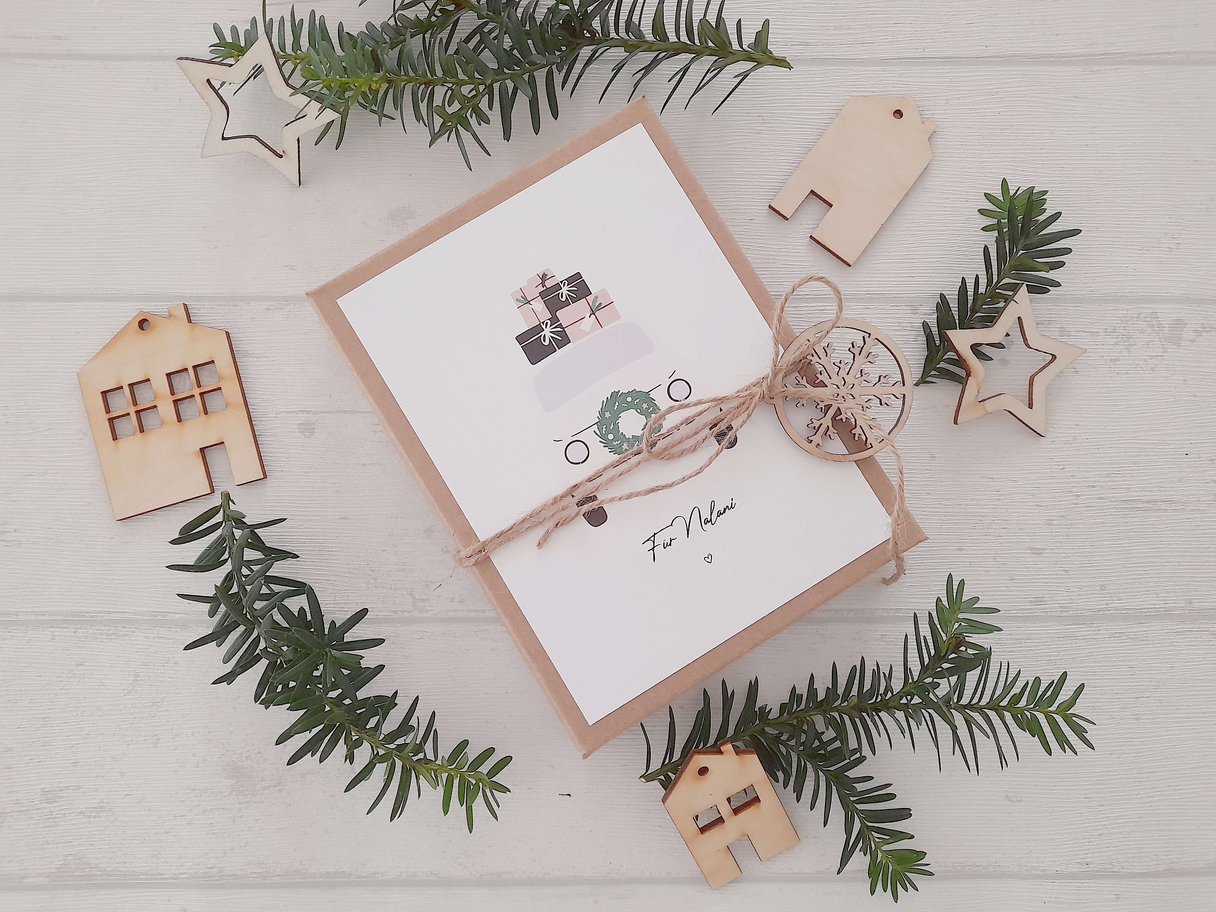 Ihr bekommt eine personalisierte Box aus Kraftpapier, vorne mit einer Postkarte und den Namen des Beschenkten.